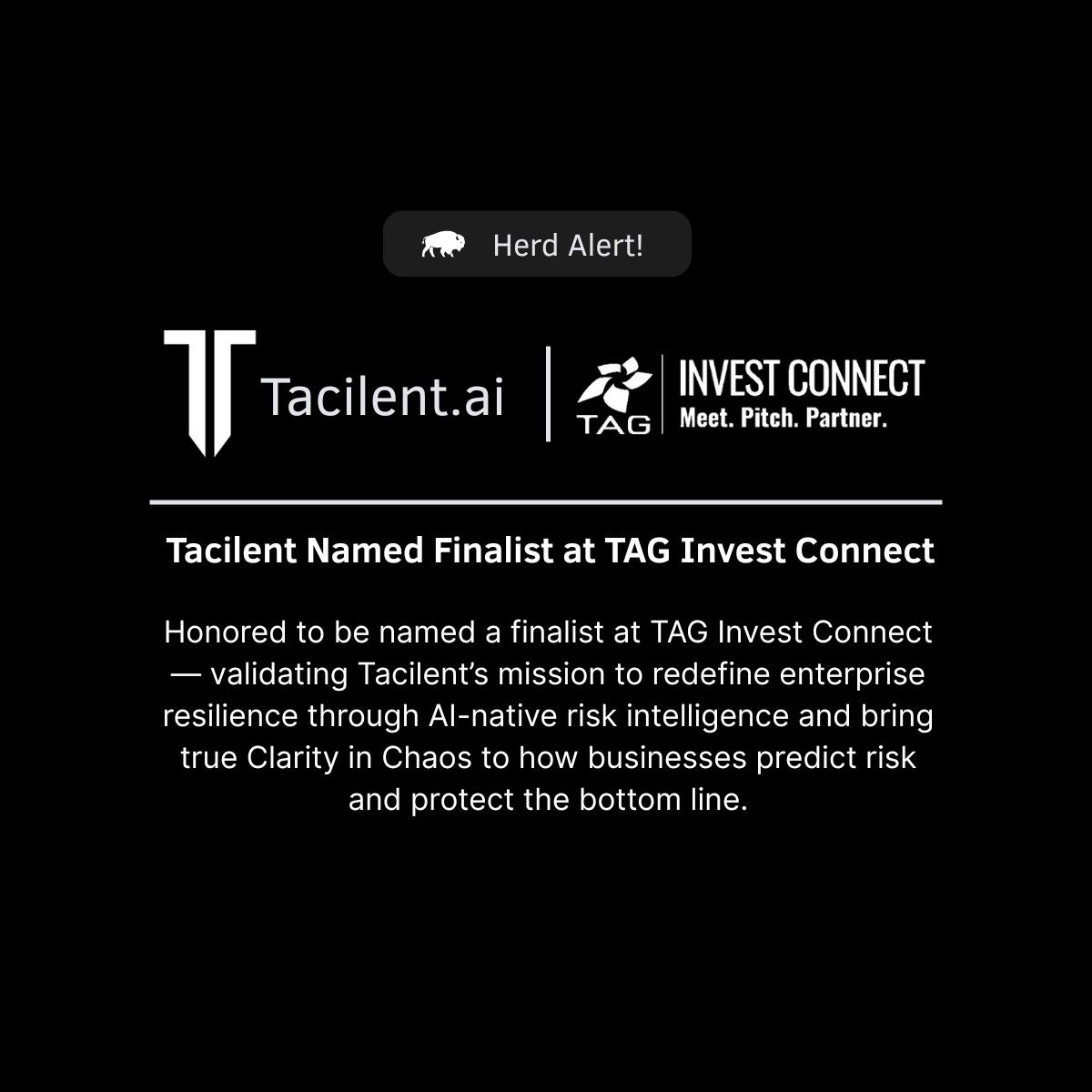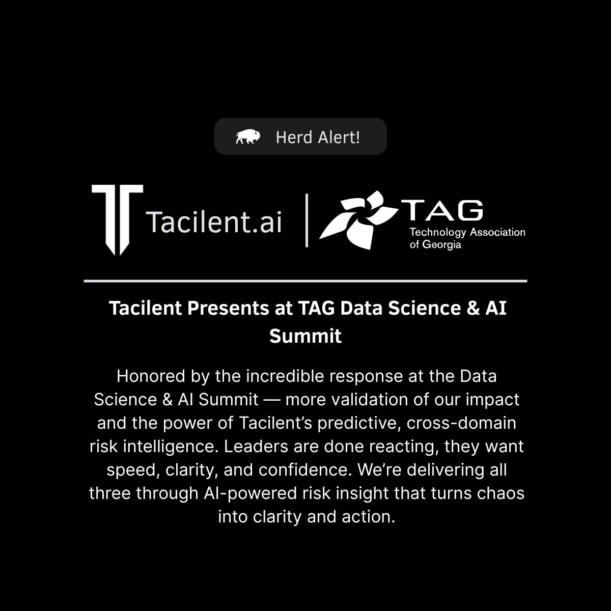 Our AI-powered risk assessments and live demo sparked nonstop conversations — drawing a packed crowd and clear validation that the market is ready for predictive, cross-domain risk intelligence that actually works. The message from leaders was clear: they’re done reacting — they want speed with clarity. And that’s exactly what Tacilent delivers. A huge thank you to TAG and everyone who stopped by to connect with us. The momentum is building fast — and this is just the beginning of how we’re bringing Clarity in Chaos to enterprise risk.