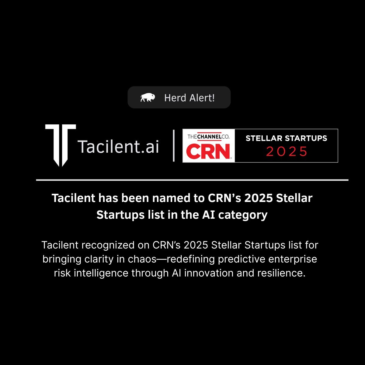 Tacilent recognized on CRN’s 2025 Stellar Startups list for bringing Clarity in Chaos — redefining predictive enterprise risk intelligence through AI innovation and resilience.This national recognition reflects our momentum and our commitment to empowering organizations to assess, predict, and act on risk in real time.