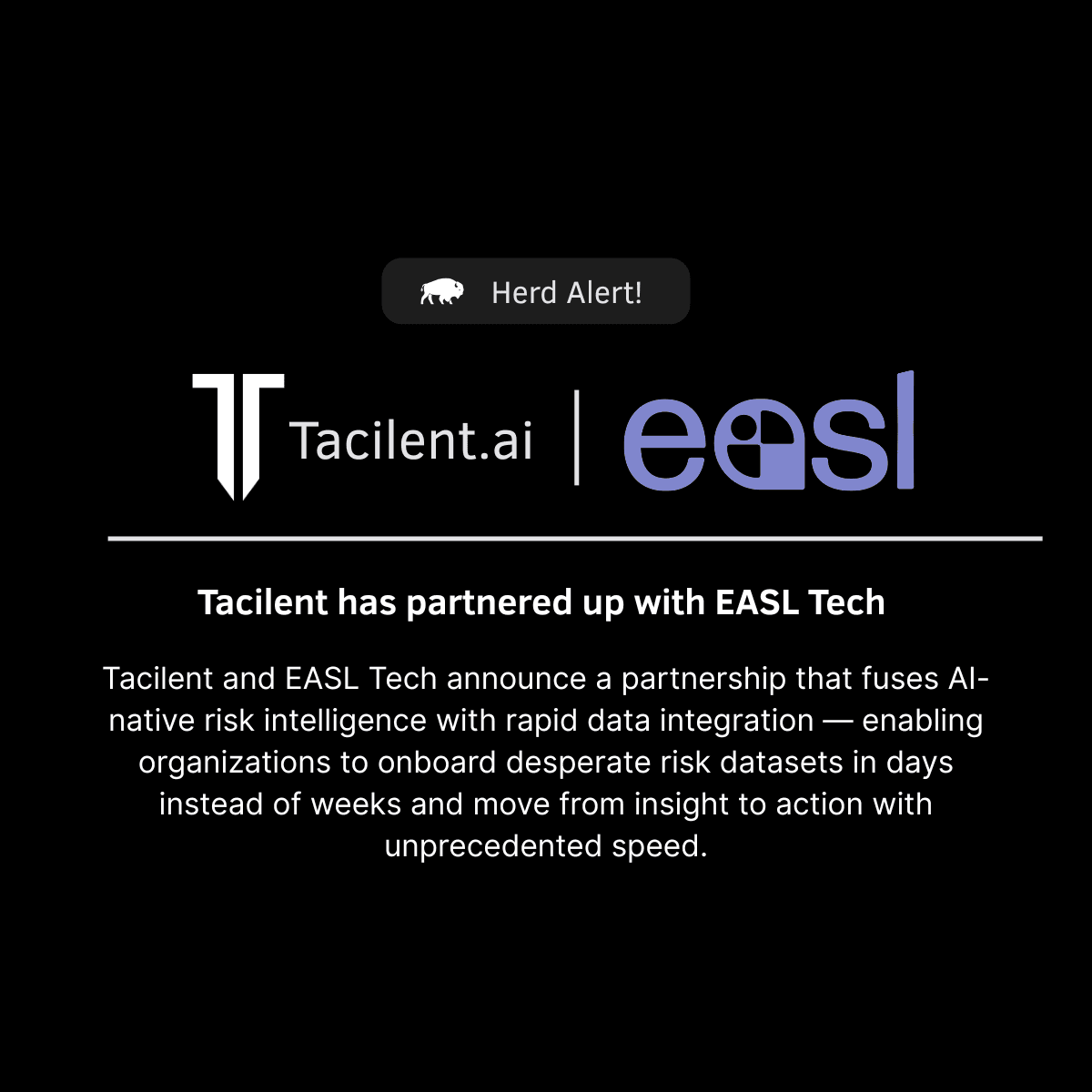 Tacilent and EASL Tech announce a partnership that fuses AI-native risk intelligence with rapid data integration — enabling organizations to onboard disparate risk datasets in days instead of months and move from insight to action with unprecedented speed.